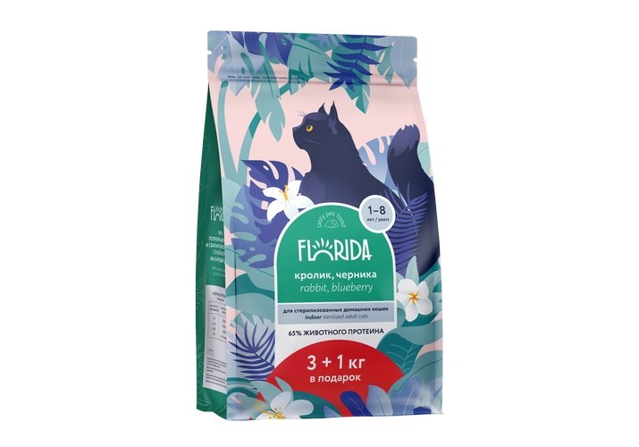 Florida Indoor Sterilized Adult Rabbit & Blueberry Сухой корм Флорида для Домашних стерилизованных кошек Кролик черника 3 кг + 1 кг