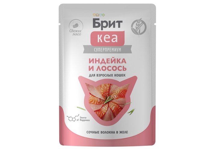 Вся линейка паучей и ламиcтеров Брит Кеа "Волокна в желе" построена на индейке как основном белке, с добавками разных морепродуктов. Это уникальная фишка линейки — моно-белковый состав на базе индейки + сочные волокна и желе, обогащенные спирулиной и таурином, создающие функциональное лакомство для взрослых кошек и котят. Сочетание диетической индейки с жирными кислотами из лосося помогает сохранить здоровье кожи и яркость шерсти. Особенности: поддержка сердечно-сосудистой системы; DHA и EPA из лосося; спирулина — природный источник витаминов группы B и хлорофилла; вкусно и полезно — без сои и злаков.