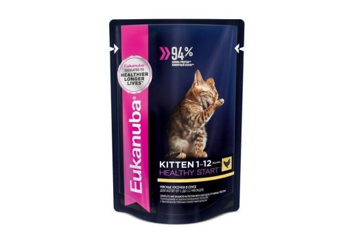 Влажный корм EUKANUBA™ HEALTHY START (ХЕЛСИ СТАРТ) для котят от 1 до 12 месяцев из курицы в соусе содержит все необходимые для здорового роста питательные вещества, включая докозагексаеновую кислоту (ДГК), поддерживающую развитие мозга.