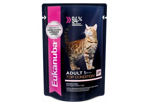 Влажный корм EUKANUBA™ TOP CONDITION (ТОП КОНДИШН) для взрослых кошек старше 1 года с лососем в соусе при ежедневном употреблении обеспечивает оптимальный уровень энергии, помогает поддерживать здоровый вес и снижает риск развития заболеваний мочевыводящих путей у вашей активной кошки.