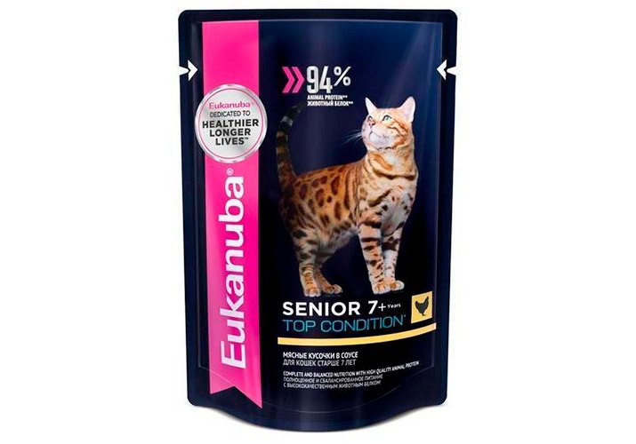 Влажный корм EUKANUBA™ TOP CONDITION (ТОП КОНДИШН) для взрослых кошек старше 7 лет из курицы в соусе содержит все необходимые питательные вещества, в том числе антиоксиданты, которые помогают поддержать здоровье стареющего питомца.