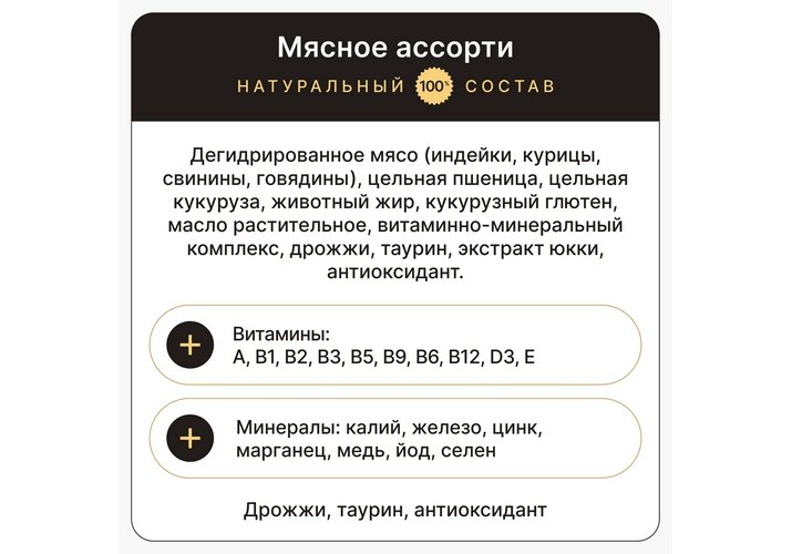 Дегидрированное мясо (индейки, курицы, свинины, говядины), цельная пшеница, цельная кукуруза, животный жир, кукурузный глютен, масло растительное, витаминно-минеральный комплекс, дрожжи, таурин, экстракт юкки, антиоксидант.