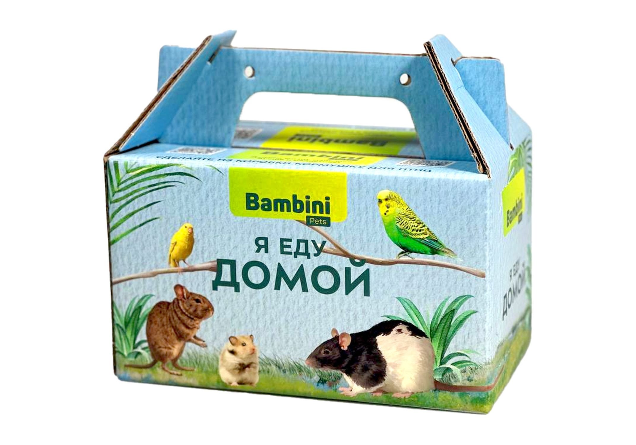 Bambini Pets переноска-кормушка для птиц и грызунов. Подойдет для транспортировки птиц малых и средних размеров, а также для мелких грызунов. После траснпортировки питомца из коробки можно сделать кормушку для уличных птиц.