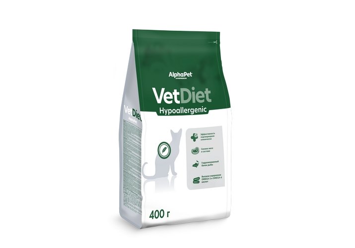 AlphaPet Vet Diet Hypoallergenic Диетический корм АльфаПет для взрослых кошек при Пищевой аллергии и непереносимости ингредиентов 400 г