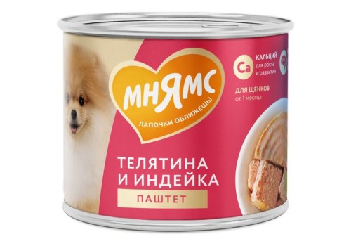 Любознательным и подвижным щенкам на этапе роста особенно нужен сбалансированный и здоровый рацион. Паштет из телятины и индейки для щенков старше 1 месяца – поможет малышу всегда быть в активной форме, расти сильным и крепким и дарить счастье всем вокруг. Заботьтесь о своем щенке правильно вместе с «Мнямс».