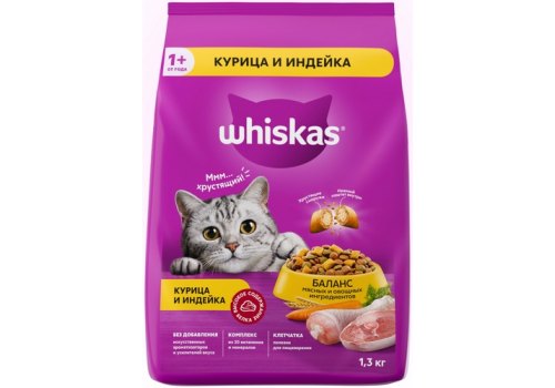 Whiskas Сухой корм Вискас для взрослых кошек подушечки-паштет с Курицей и индейкой 1,3 кг