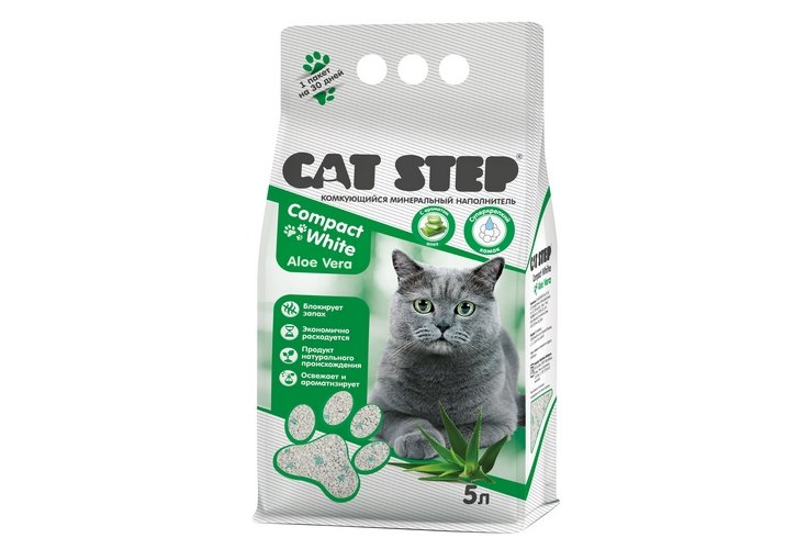 Cat Step Compact White Aloe Vera Наполнитель Кэт Степ для туалета котят комкующийся Минеральный с ароматом Алоэ Вера 5 л