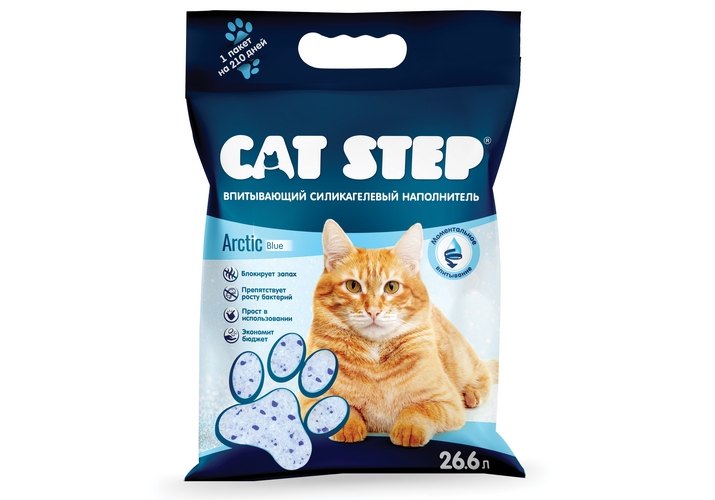 Cиликагелевый наполнитель для кошачьего туалета CAT STEP Arctic Blue с цветными синими гранулами моментально впитывает влагу и уничтожает запахи. Пористая структура кристаллов обеспечивает их высокую способность к поглощению жидкостей и запахов. Наполнитель препятствует размножению и развитию бактерий и грибков за счет своего неорганического происхождения. Наполнитель не требует постоянного контроля и ежедневной уборки кошачьего лотка. Содержимого пакета 26,6 л хватает в среднем на 7 месяцев использования. Заполните сухой и чистый лоток наполнителем CAT STEP Arctic Blue слоем 3-5 см. Регулярно удаляйте экскременты и перемешивайте наполнитель для равномерного распределения свежих кристаллов. Примерно через 4 недели удалите использованные гранулы и замените их новой порцией наполнителя. Не выбрасывайте использованный наполнитель в унитаз. Объем: 26,6 л.