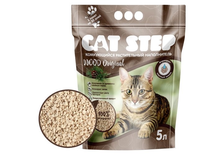 Cat Step Wood Original Комкующийся растительный наполнитель Кэт Степ для кошачьего туалета Древесный 5 л