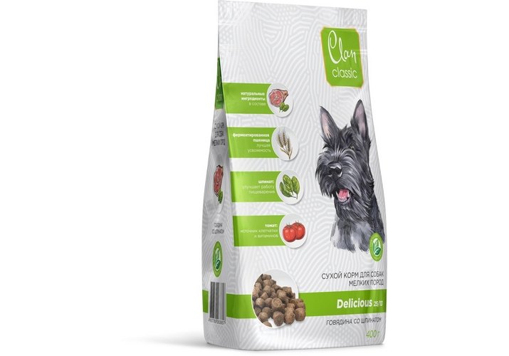 Clan Classic Delicious 25-13 Сухой корм Клан для собак Мелких пород Говядина томат шпинат 400 г