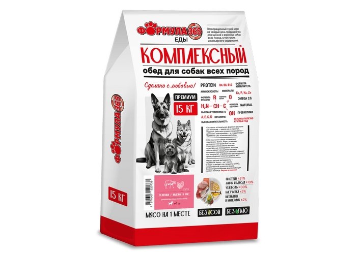Формула 365 Комплексный обед Сухой корм для взрослых собак крупных пород Телятина Индейка и рис 15 кг