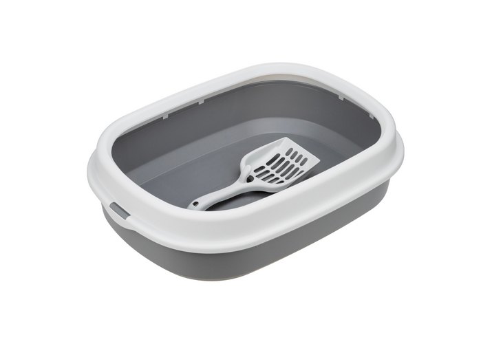 Лоток имеет эргономичную форму. Его верхний край закруглён, что предотвращает выпадение наполнителя при интенсивном использовании. К лотку прилагается совок для уборки, он легко крепится на бортик лотка.