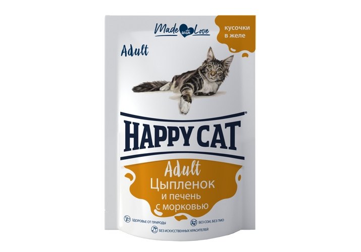 Happy Cat Паучи Хэппи Кэт для кошек Цыпленок, Печень, морковь в желе (цена за упаковку, Россия) 85г х 24шт