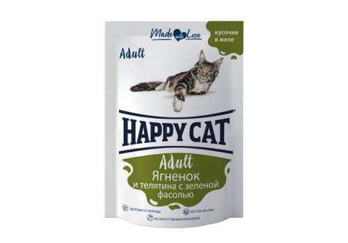 Happy Cat Паучи Хэппи Кэт для кошек Ягненок, Телятина, зеленая фасоль в желе (цена за упаковку, Россия) 85г х 24шт