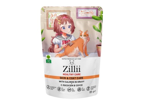 Zillii Healthy Care Skin Coat Care Влажный корм Зилли для взрослых кошек Поддержка здоровья кожи и шерсти с Лососем в соусе (цена за упаковку) 85г х 24шт