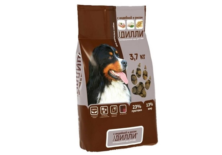 Корма "Дилли" - полноценное, сбалансированное и разнообразное питание для собаки. Соотношение в кормах белков, жиров, витаминов и микроэлементов удовлетворяет все потребности в питании растущих щенков и взрослых собак.