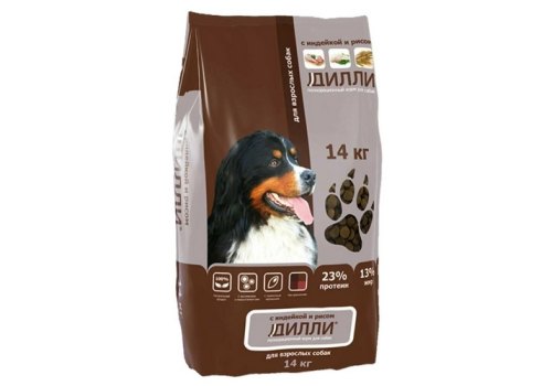 Корма "Дилли" - полноценное, сбалансированное и разнообразное питание для собаки. Соотношение в кормах белков, жиров, витаминов и микроэлементов удовлетворяет все потребности в питании растущих щенков и взрослых собак.