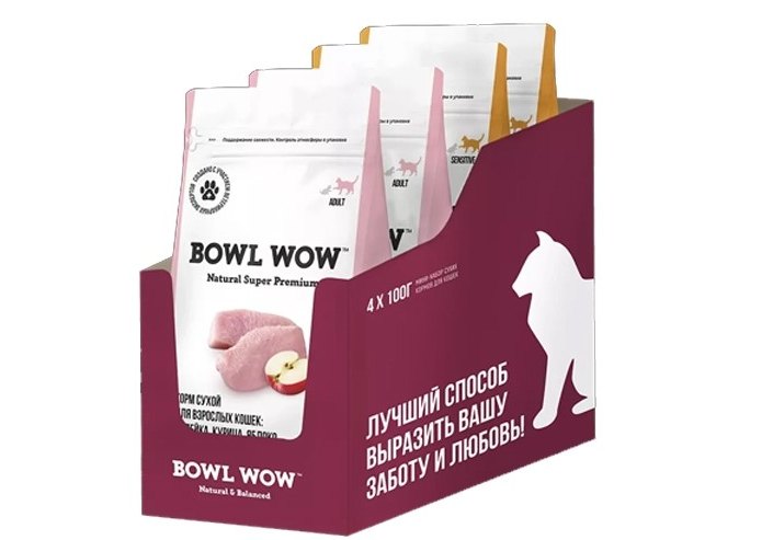 BOWL WOW Мини-набор Боул Вау сухих кормов для взрослых кошек с чувствительным пищеварением с Яблоком и Тыквой (цена за упаковку) 100г х 4шт