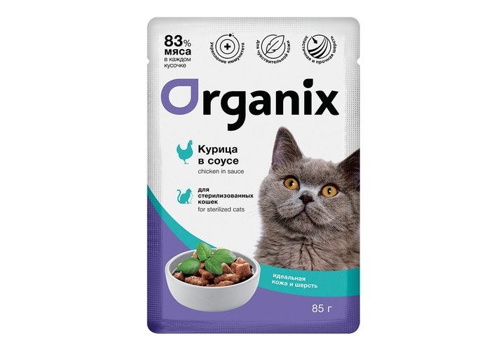 Organix Влажный корм Органикс для стерилизованных для Кожи и шерсти Курица в соусе (цена за упаковку) 85г х 24шт