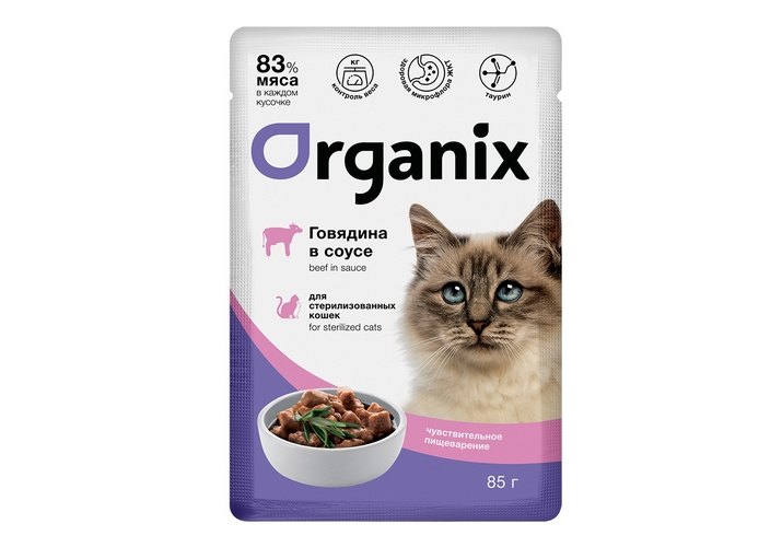 Organix Влажный корм Органикс для стерилизованных с Чувствительным пищеварением Говядина в соусе (цена за упаковку) 85г х 24шт
