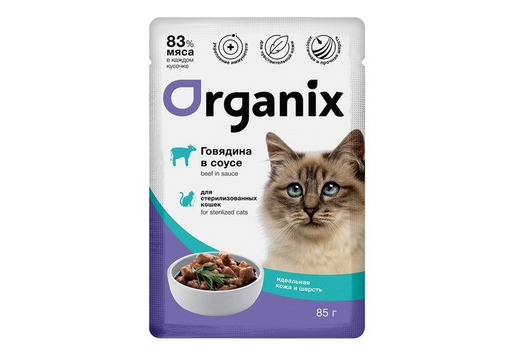Organix Влажный корм Органикс для стерилизованных для Кожи и шерсти Говядина в соусе (цена за упаковку) 85г х 24шт