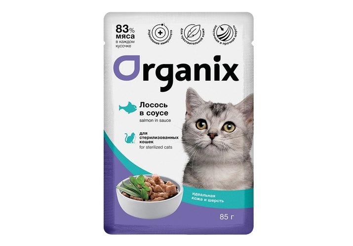 Organix Влажный корм Органикс для стерилизованных для Кожи и шерсти Лосось в соусе (цена за упаковку) 85г х 24шт