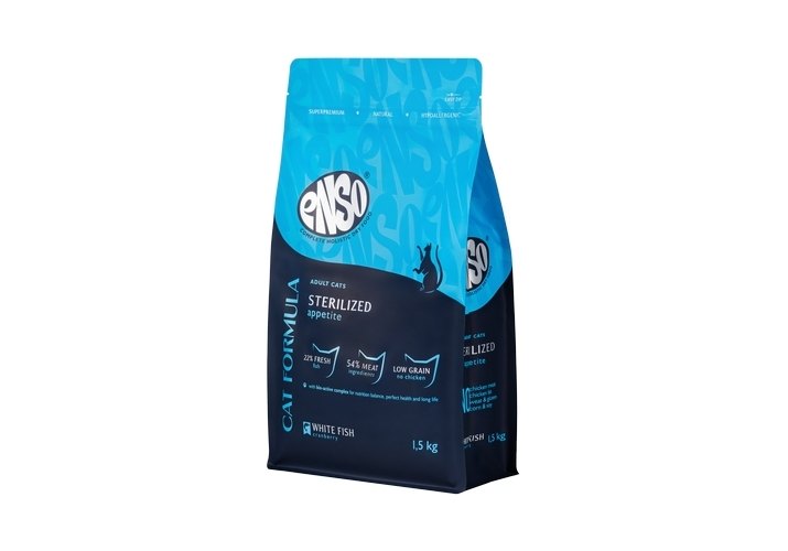 ENSO Cat formula Sterilized – сухой полнорационный корм для стерилизованных кошек со свежей белой рыбой с добавлением клюквы.