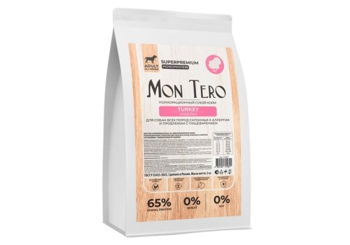 Mon Tero Superpremium Adult All Breed Monoprotein Turkey Сухой корм Мон Теро для собак всех пород склонных к аллергии и проблемам с пищеварением из Индейки 2 кг
