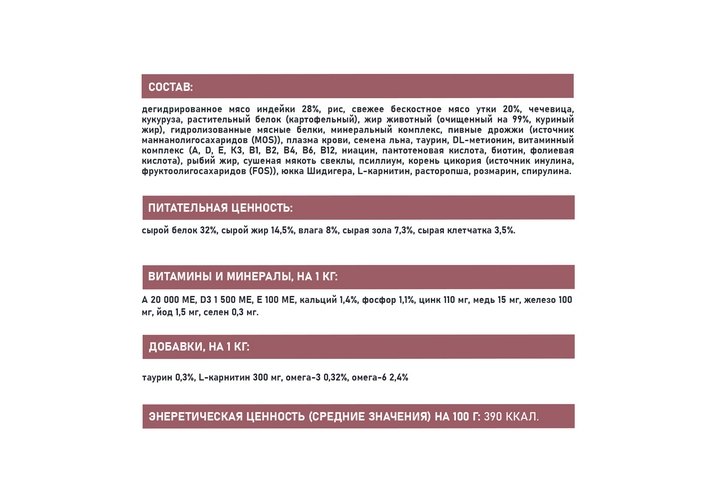 Таурин 0,3%, L-карнитин 300 мг, омега-3 0,32%, омега-6 2,4%.