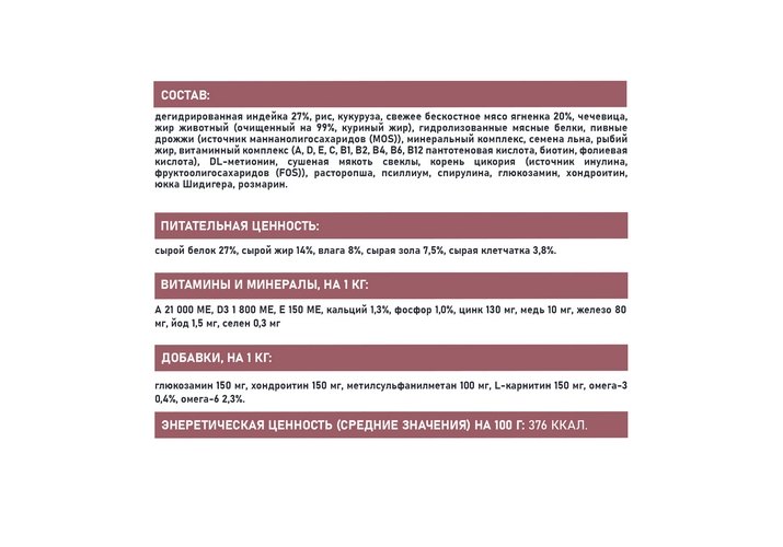 Дегидрированная индейка 27%, рис, кукуруза, свежее бескостное мясо ягненка 20%, чечевица, жир животный (очищенный на 99%, куриный жир), гидролизованные мясные белки, пивные дрожжи (источник маннанолигосахаридов (MOS)), минеральный комплекс, семена льна, рыбий жир, витаминный комплекс (A, D, E, C, B1, B2, B4, B6, B12 пантотеновая кислота, биотин, фолиевая кислота), DL-метионин, сушеная мякоть свеклы, корень цикория (источник инулина, фруктоолигосахаридов (FOS)), расторопша, псиллиум, спирулина, глюкозамин, хондроитин, юкка Шидигера, розмарин.