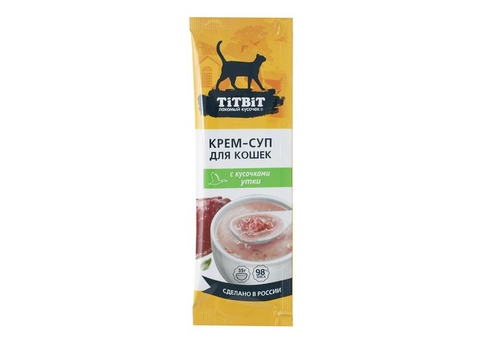Крем-суп для кошек TITBIT – это специально разработанные вкусные и полезные продукты, которые: 1. Содержат кусочки свежего мяса; 2. Содержат 98% мясных ингредиентов; 3. Содержат дополнительные полезные ингредиенты (таурин для поддержки зрения, сердца, пищеварительной, половой и иммунной систем; морковь для поддержки зрения и пищеварения; петрушка для поддержки мочеполовой, сердечно-сосудистой и пищеварительной систем).