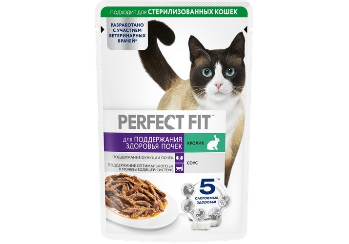 Влажный рацион PERFECT FIT "Здоровье почек" с кроликом в соусе разработан специально для поддержания здоровья почек кошек. ПОДДЕРЖАНИЕ ФУНКЦИИ ПОЧЕК - Ограниченный уровень фосфора, омега-3 жирные кислоты и калий способствуют поддержанию здоровья почек.