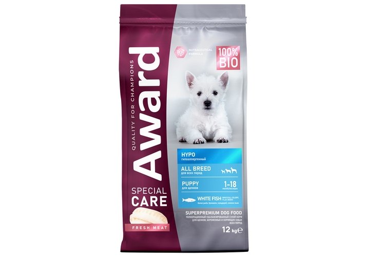 Award Special Care Hypo Сухой корм Авард для щенков от 1 месяца, беременных и кормящих собак всех пород Гипоаллергенный с Белой рыбой 12 кг
