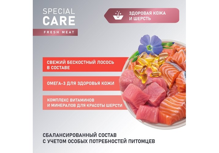 Сбалансированный полнорационный сухой корм со свежим лососем с добавлением рыбьего жира и семян льна - это функциональное питание для взрослых собак всех пород, которое способствует уменьшению воспалений, улучшению состояния кожи и восстановлению блеска шерсти, обеспечивая комплексную заботу о здоровье вашего питомца на долгие годы. Корм Award - тщательно сбалансированная рецептура из 100% натуральных ингредиентов, созданная по инновационной формуле, обеспечивающей комплексную нутрицевтическую поддержку организма питомца. Свежий лосось в составе обладает высокой вкусовой привлекательностью и является ценным источником легкоусвояемого животного белка.При изготовлении корма использовалась технология 3NRGY — сочетание полезных углеводов, дающее длительный запас энергии и чувство сытости.Содержит рыбий жир, богатый незаменимыми жирными кислотами Омега-3 и Омега-6, которые помогают бороться с воспалениями и предотвращают сухость кожи. Семена льна, источник многих витаминов и минералов, необходимых для поддержания здоровья кожи и блеска шерсти. Пантотеновая кислота в составе витаминного комплекса укрепляет защитный барьер кожи.