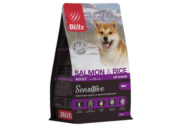 Blitz Sensitive Adult All Breeds Salmon&Rice Сухой корм Блиц для взрослых собак всех пород Лосось рис 1,8 кг
