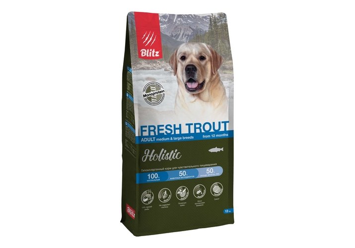 Blitz Holistic Adult Medium & Large Breeds Fresh Trout Cухой корм Блиц Монопротеиновый для собак средних и крупных пород со свежей Форелью 12 кг