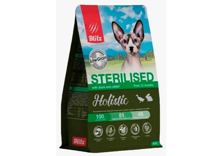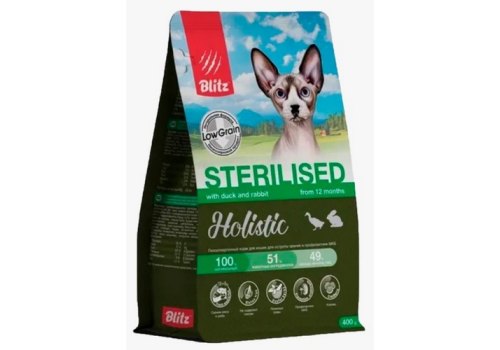 Blitz Holistic Sterilised Полнорационный сухой корм Блиц для стерилизованных кошек Утка и кролик 400 г