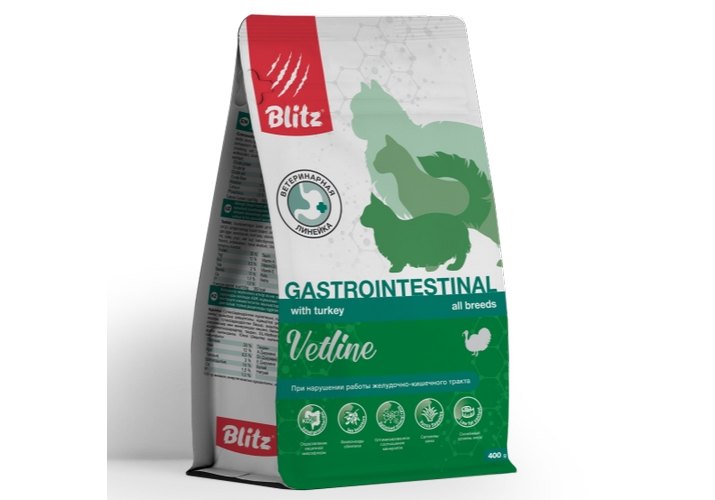 Blitz Vetline Gastrointestinal Диетический полнорационный сухой корм Блиц для взрослых кошек при нарушении работы ЖКТ 400 г