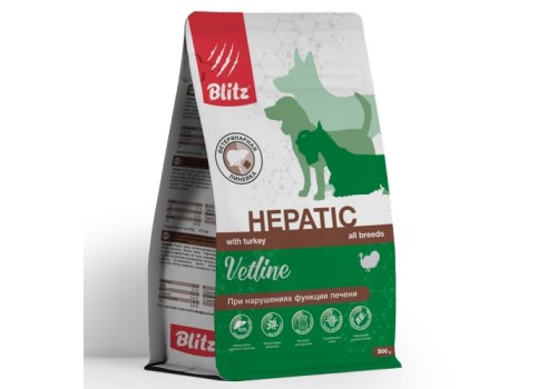 Blitz Vetline Hepatic Диетический полнорационный сухой корм Блиц для взрослых собак при нарушении функции печени 500 г