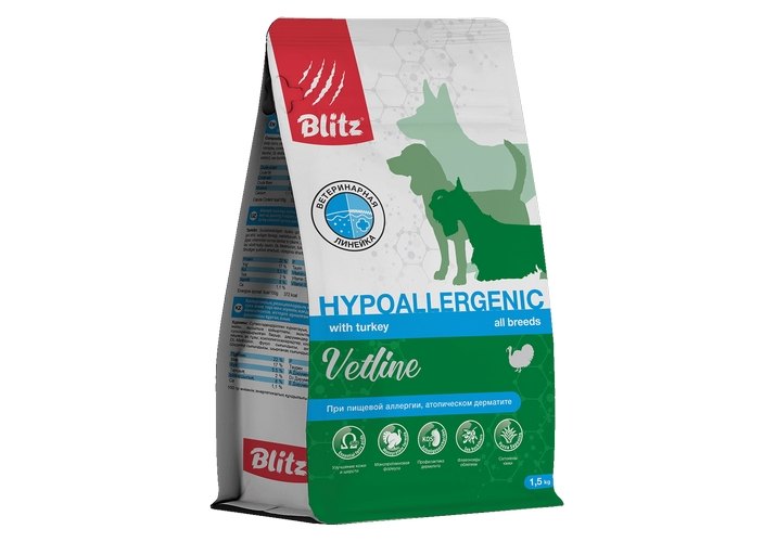 Blitz Vetline Hypoallergenic Диетический полнорационный сухой корм Блиц для взрослых собак при пищевой аллергии 1,5 кг