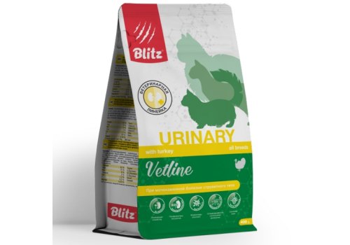 Blitz Vetline Urinary Диетический полнорационный сухой корм Блиц для взрослых кошек при мочекаменной болезни струвитного типа 400 г